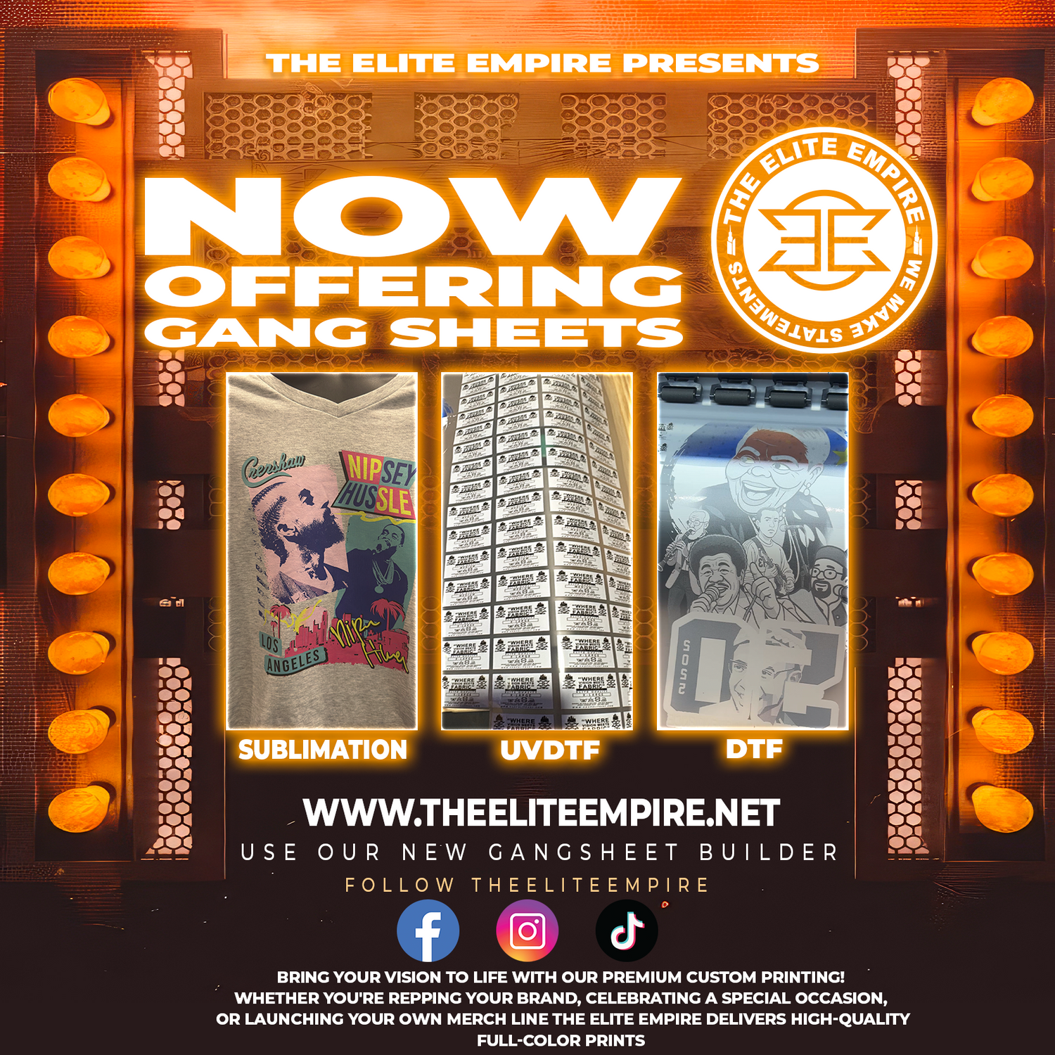 The Elite Empire is proud to introduce custom gang sheet printing now available in UV DTF, DTF, and Sublimation! Whether you’re a small business owner, crafter, or designer, our high-quality gang sheet services are perfect for bringing your vision to life—efficiently and affordably.